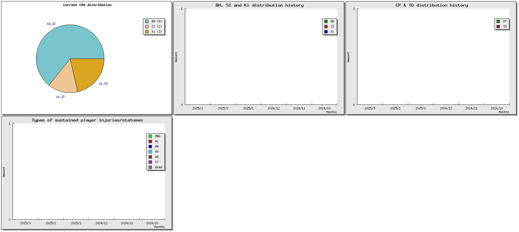 | # | Nom | Race | Valeur | W | D | L | GP | WIN% | SW | SD | SL | GF | GA | Td | Cp | Int | Cas | BH | Si | Ki | tcasf | tcasa | tcdiff | SMP | WT | ELO |